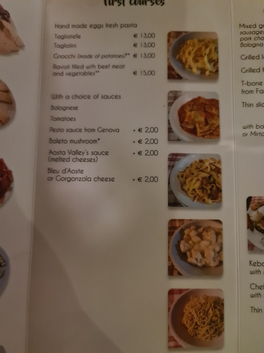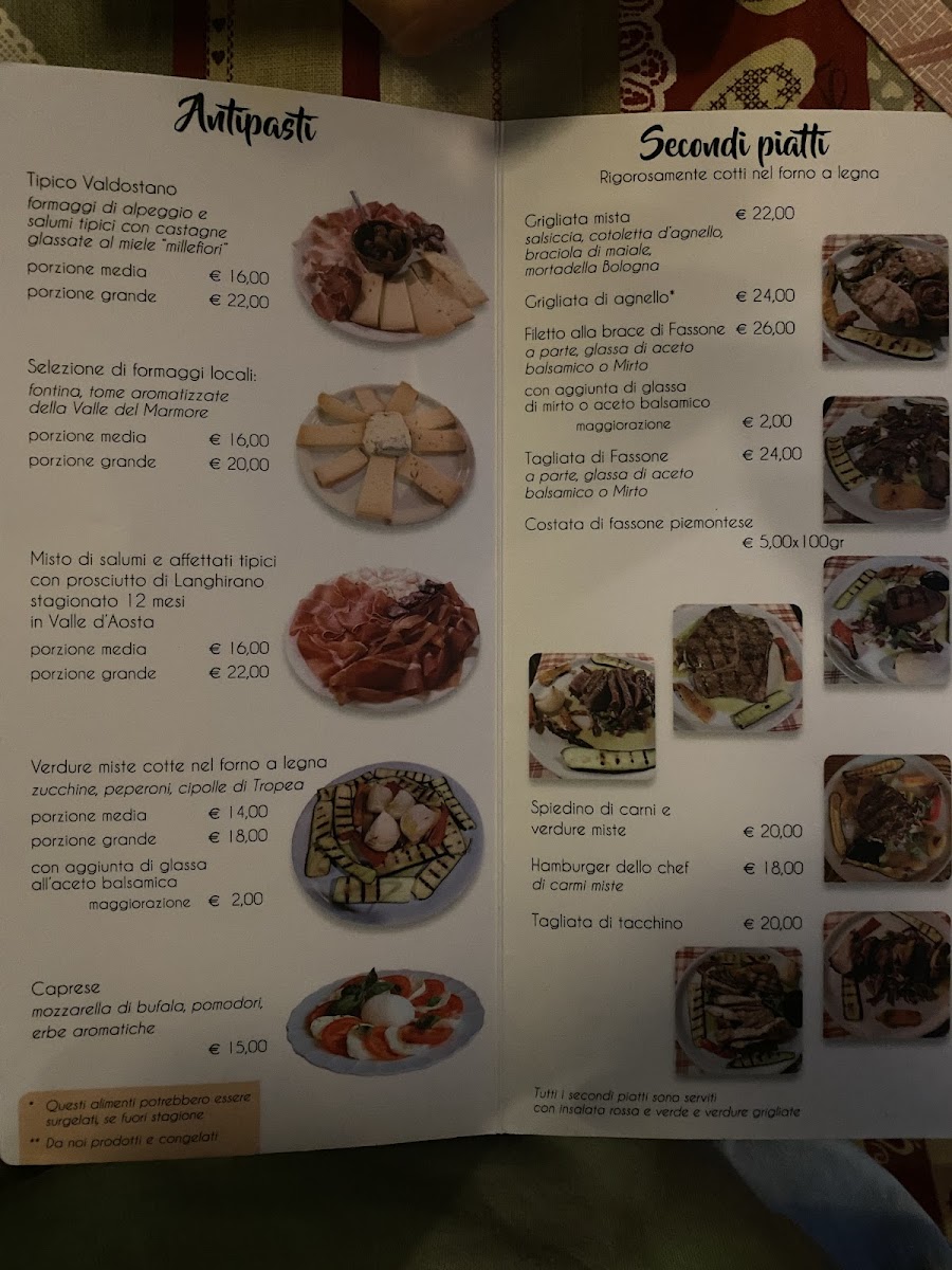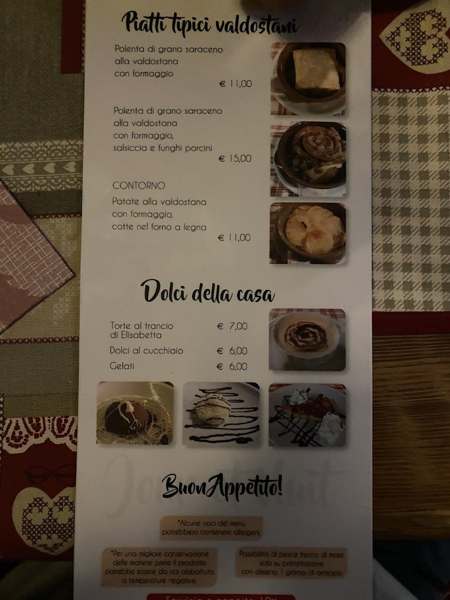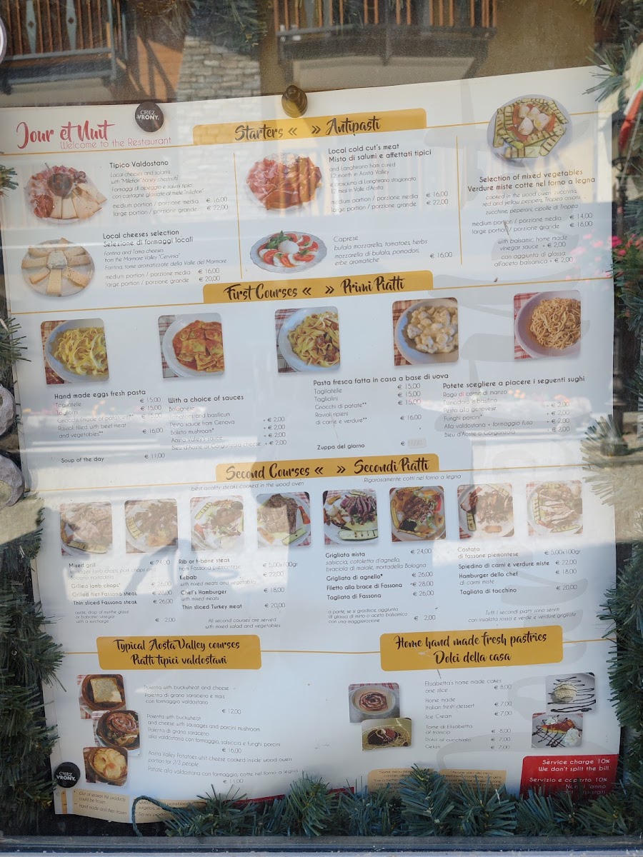 At Jour Et Nuit in Breuil-Cervinia, the menu is a delightful celebration of traditional Italian and regional flavors. The standout dishes offer a rich variety, from hearty meats to comforting sides. The Grilled Filet Fassone Steak is a tender and flavorful choice, perfect for meat lovers. Another must-try is the Polenta Salsiccia E Funghi, a rustic dish that combines the creaminess of polenta with savory sausage and mushrooms. For something uniquely local, the Patate Valdostane Con Formaggio is a comforting potato dish with melted cheese, embodying the flavors of the Aosta Valley. The Tagliere Prosciutti E Formaggi Valdostani is a delightful charcuterie board featuring local cured meats and cheeses, ideal for sharing. For a feast, the Mixed Grill Platter offers a variety of grilled meats that will satisfy any carnivore’s cravings, while the T Bone Steak for 2 is a perfect choice for those seeking a special meal with a friend or loved one. Accompanying the meats, the Verdure Grigliate and Verdure Alla Griglia provide a delicious and healthy balance of grilled vegetables. Whether you’re looking for a satisfying meal after a day on the slopes or a relaxing dinner with loved ones, the diverse and flavorful menu at Jour Et Nuit offers something for everyone.