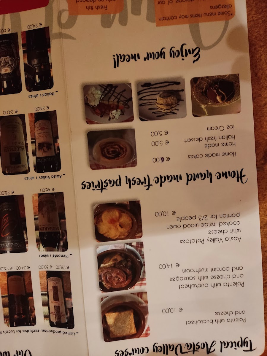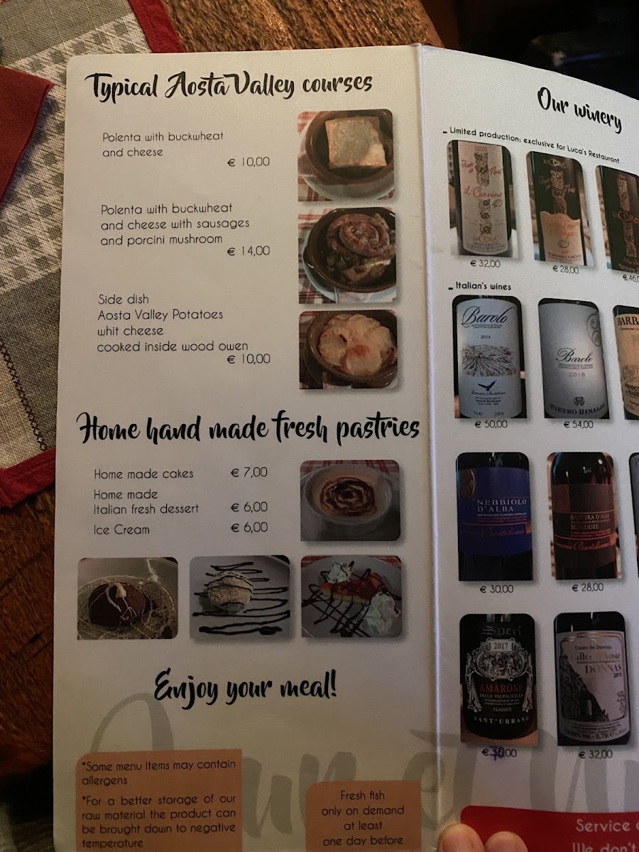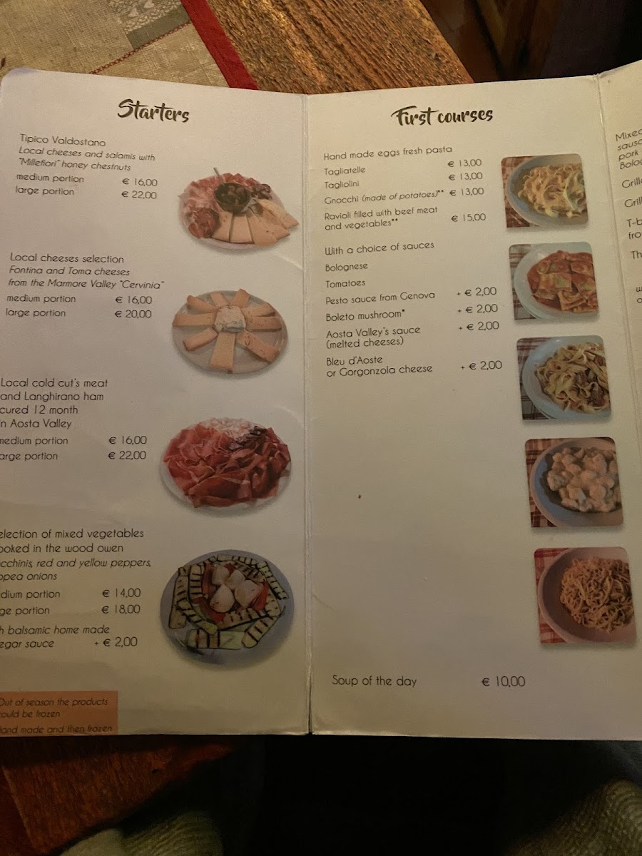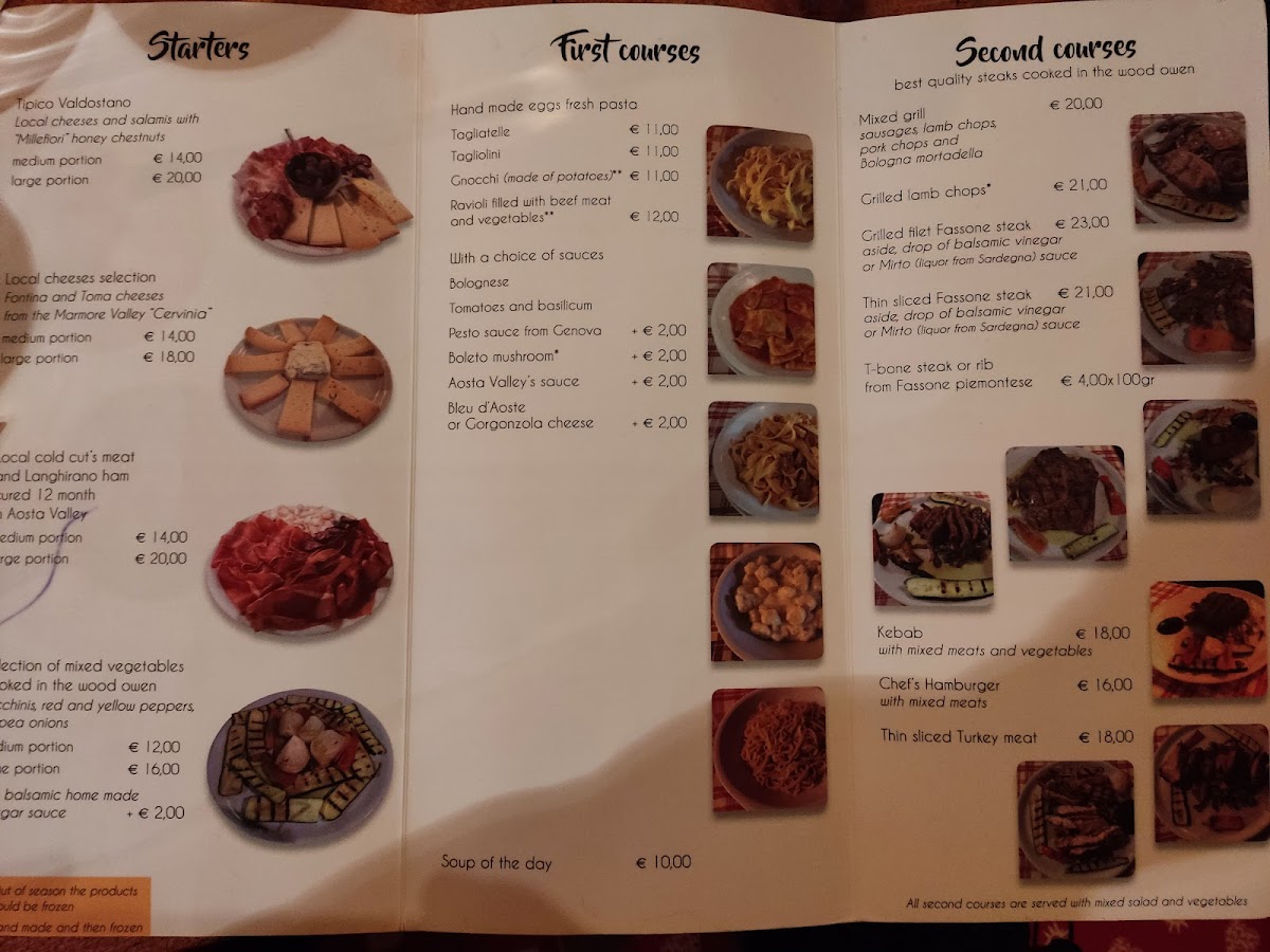 At Jour Et Nuit in Breuil-Cervinia, the menu is a delightful celebration of traditional Italian and regional flavors. The standout dishes offer a rich variety, from hearty meats to comforting sides. The Grilled Filet Fassone Steak is a tender and flavorful choice, perfect for meat lovers. Another must-try is the Polenta Salsiccia E Funghi, a rustic dish that combines the creaminess of polenta with savory sausage and mushrooms. For something uniquely local, the Patate Valdostane Con Formaggio is a comforting potato dish with melted cheese, embodying the flavors of the Aosta Valley. The Tagliere Prosciutti E Formaggi Valdostani is a delightful charcuterie board featuring local cured meats and cheeses, ideal for sharing. For a feast, the Mixed Grill Platter offers a variety of grilled meats that will satisfy any carnivore’s cravings, while the T Bone Steak for 2 is a perfect choice for those seeking a special meal with a friend or loved one. Accompanying the meats, the Verdure Grigliate and Verdure Alla Griglia provide a delicious and healthy balance of grilled vegetables. Whether you’re looking for a satisfying meal after a day on the slopes or a relaxing dinner with loved ones, the diverse and flavorful menu at Jour Et Nuit offers something for everyone.